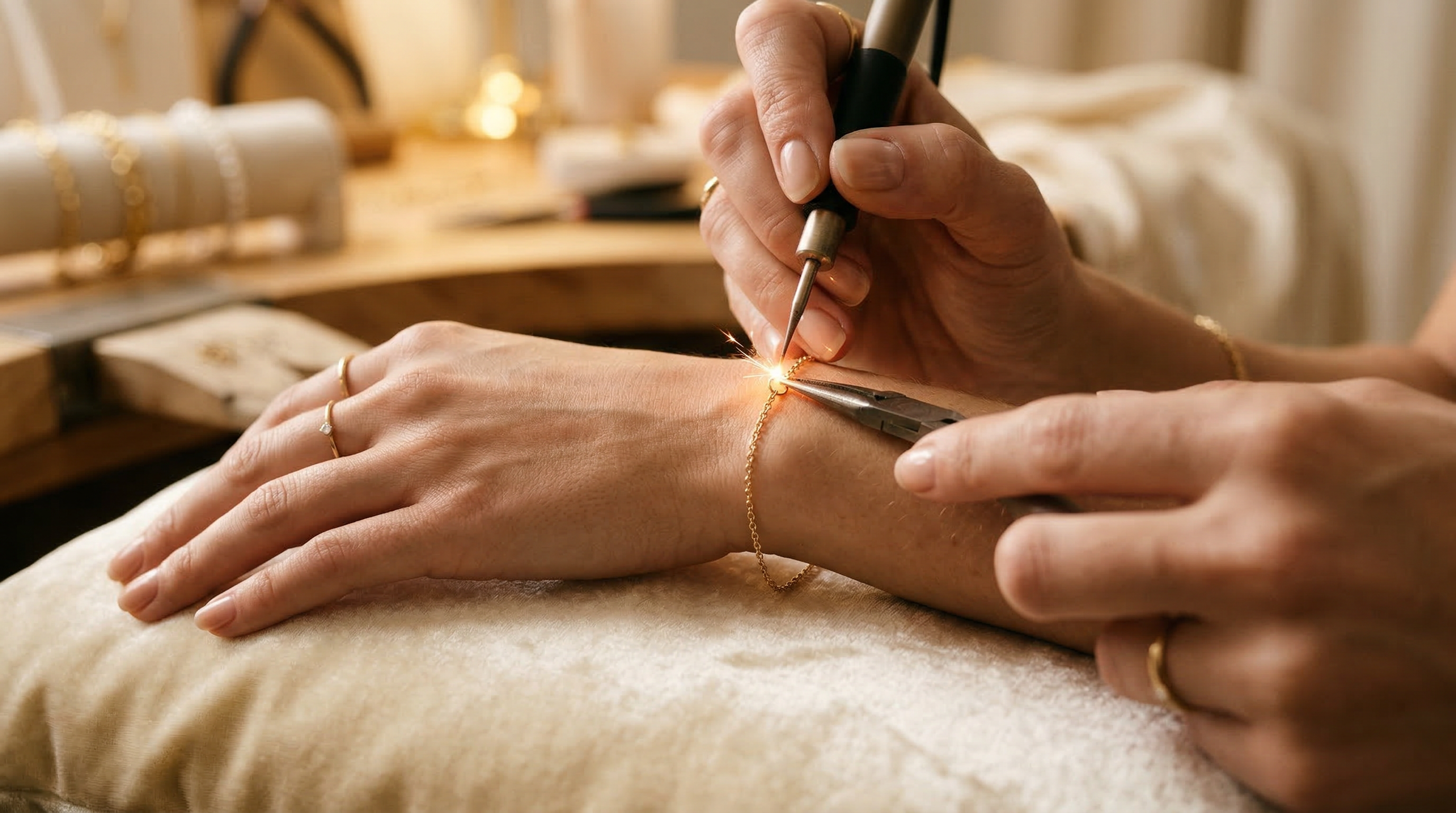 Permanent jewelry isn't a purchase — it's a ritual. A tiny spark bonds a seamless chain to your wrist, your ankle, your neck. No clasp. No closure. Just a piece of you, forever.